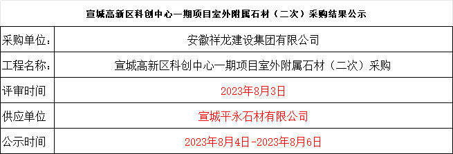 宣城高新區(qū)科創(chuàng)中心一期項(xiàng)目室外附屬石材(二次)采購(gòu)結(jié)果公示