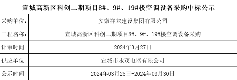 宣城高新區科創二期項目8#、9#、19#樓空調設備采購中標公示
